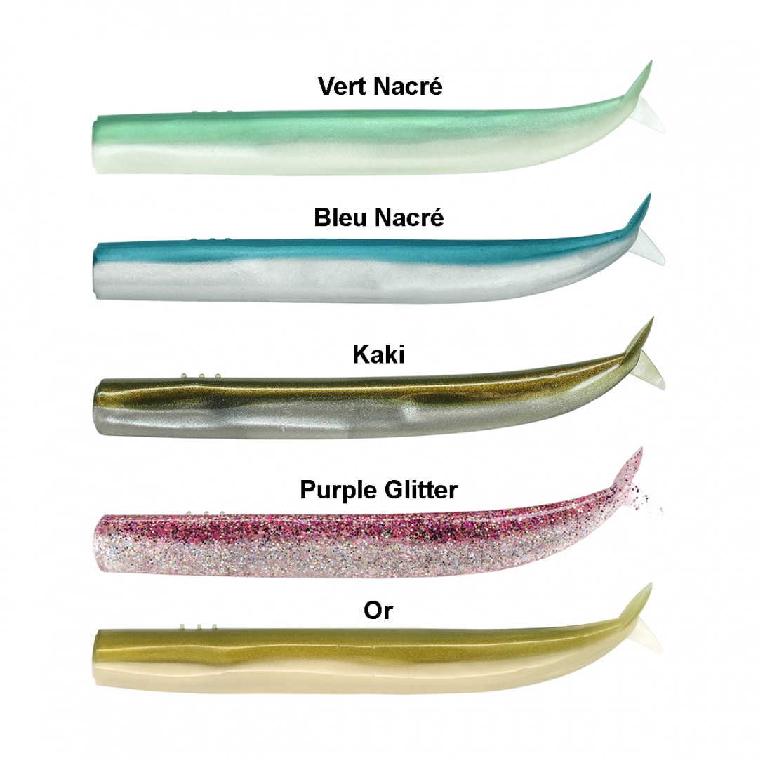 FIIISH CRAZY SAND EEL è la prima anguilla creata dal’azienda francese che ha avuto un sacco di successo grazie al suo artificiale Black Minnow. A differenza di quest’ultimo la Crazy Sand Eel è fornita con testa piombata classica. La particolare mescola siliconica e il sistema HSV (nuoto ad alte vibrazioni) rende il nuoto di questa anguilla spettacolare. Il corpo è impregnato di sostanze attrattive. La COMBO (pronto pesca) è formata da una testa piombata con amo (del solito colore del corpo), e da due corpi in silicone (uno già montato e uno di ricambio)dotate di rattle. La DOUBLE COMBO (pronto pesca) è formata da due anguille già montate sulla testa piombata (dotate di rattle).