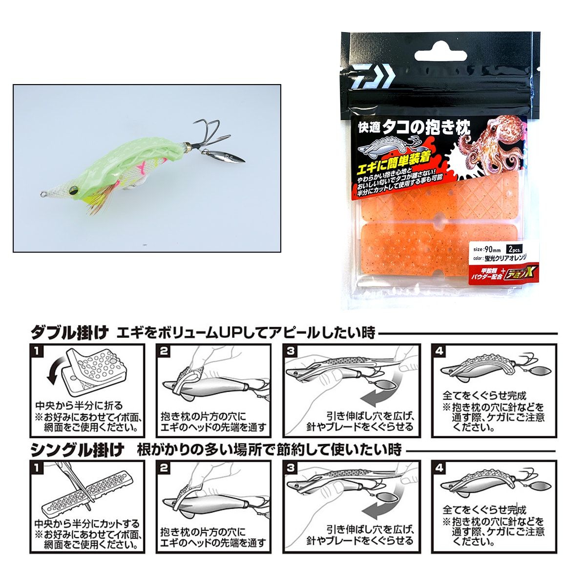DAIWA COVER KAITEKI TAKO NO DAKIMAKURA (cover aromatizzata) รจ un innovativo accessorio in silicone elasticizzato e aromatizzato da applicare al tako egi per aumentarne il potere attirante. Puรฒ essere utilizzato singolarmente o anche applicarne all’interno un pezzo di esca naturale. Ogni bustina contiene due cover.