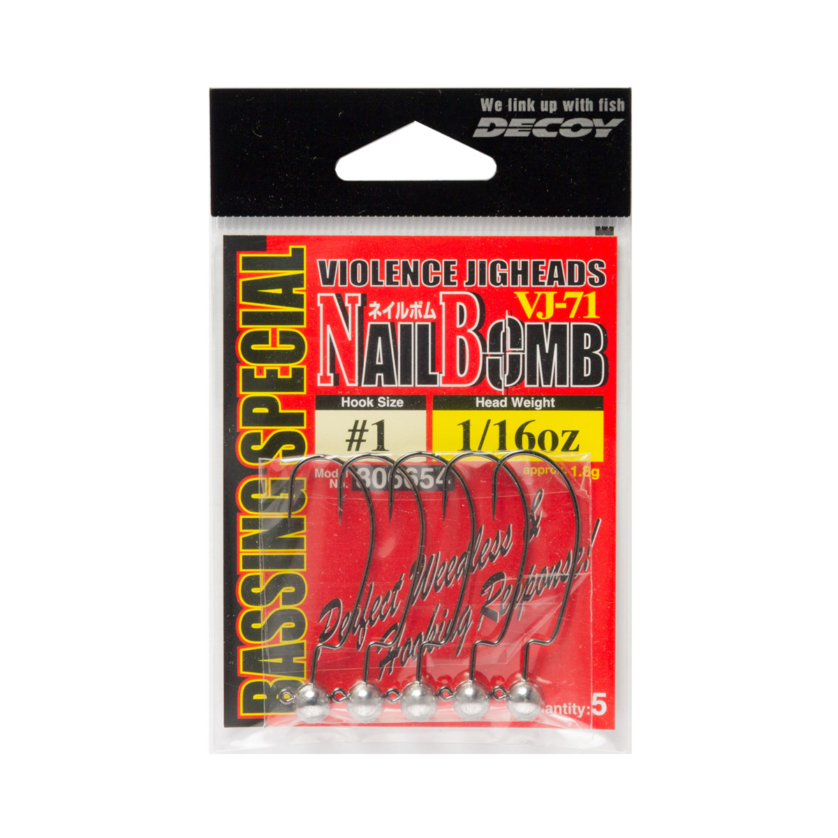 DECOY VJ-71 NAIL BOMB รจ una jig head con amo offset studiata per innescare le softbait con amo coperto per pescare in spot pieni di ostacoli. Il disegno dona all’esca un movimento che rolla leggermente durante il nuoto. Testa in piombo. Varie misure disponibili.