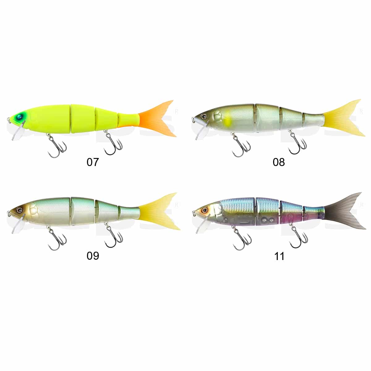 DEPS new HIGHSIDER 172 HIGH-FLOAT è una swimbait galleggiante che è stata sviluppata dopo il successo della prima versione uscita nel 2007. Il maestro Okumura ha deciso di riprendere in mano il progetto per creare una nuova cranking big bait che imitasse molto fedelmente il nuoto di un pesce in fuga. L’angolo degli snodi, il bilanciamento dei pesi interni e la forma del corpo sono simili al modello del 2007 mentre il primo sostanziale cambiamento sta nel materiale del corpo (non più in resina espansa) ma realizzato in ABS con l’aggiunta di una sottile coda in elastomero. Il nuoto estremamente naturale nasce dal suo corpo formato da 4 sezioni e dalla forma a ventaglio della sottile coda che riesce a far ondulare la parte centrale del corpo. Aggiustando l’angolo del primo giunto, inoltre, è possibile regolare precisamente il movimento. New Highsider 172 HF è equipaggiato con una paletta in policarbonato molto resistente agli urti che lo fa scendere fino a 1.5m di profondità, setting perfetto per utilizzarlo come un crankbait intorno a rami o altre tipologie di ostacoli. La particolarità di questa paletta è la facile rimozione grazie ad una pratica leva a clip integrata: rimuovendola e utilizzando l’esca con recuperi veloci è possibile imitare un pesce nel panico che scappa sotto il pelo dell’acqua creando onde superficiali che scatenano attacchi di reazione. DEPS new HIGHSIDER 172 HIGH-FLOAT (17.2cm/70g) è equipaggiato con due ancorette misura #1/0 ed è disponibile in varie colorazioni.