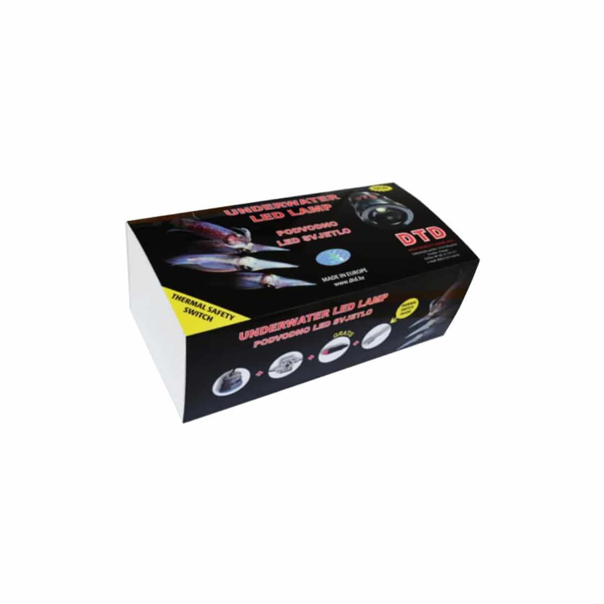 DTD UNDERWATER LED LAMP PROFI WHITEย รจ una lampada a LED da 15W con 1800 lumen di potenza adatta per essere immersa in acqua, utilizzata per la pesca dei calamari in notturna. Puรฒ essere alimentata da una batteria 12V, il consumo รจ di 1 Ah. Viene fornita con cavo di 6 metri, regolatore di intensitร e thermal switch.