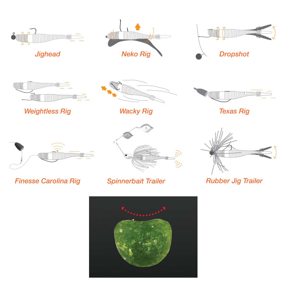 DUO REALIS V-TAIL SHAD รจ uno shad a con la coda di rondine nel quale รจ stata presentata molta attenzione nella mescola. Infatti la mescola รจ stata trattata in superficie in modo da essere utilizzato a varie profonditร sempre con la stessa efficacia. DUO V-TAIL SHAD puรฒ essere innescato in una moltitudine di inneschi a partire dalla classica JIG HEAD a inneschi piรน ricercati (NEKO RIG, DROPSHOT, WACKY HEAD, WEIGHTELESS RIG, FINESSE CAROLINA RIG, TEXAS RIG) o come trailer (SPINNERBAIT TRAILER, RUBBER JIG TRAILER). SQUID FLAVOUR. SALTED BAIT. MADE IN JAPAN. FECO, prodotto Eco-friendly certificato dall’organizzazione giapponese JB/NBC.