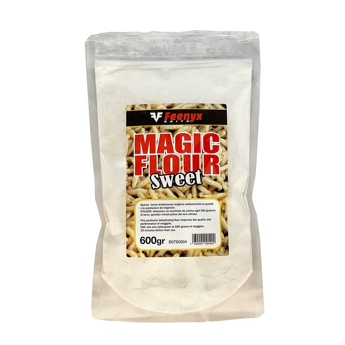 FEENYX MAGIC FLOUR รจ una farina che migliora nettamente la presentazione delle larve oltre a fornire loro un aroma estremamente attrattivo. Un cucchiaio da cucina per 500gr di bigattini almeno 15 minuti prima dellโuso (per una massima resa prepararli la sera prima e ripetere lโoperazione 15 minuti prima di pescare). Due gusti disponibili. Confezione da 600 grammi.