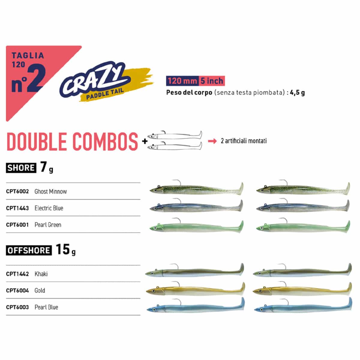 FIIISH CRAZY PADDLE TAIL N°2 120 DOUBLE COMBO OFFSHORE è lungo 12 centimetri e pesa complessivamente 19.5g (testa OFFSHORE 15g + corpo 4.5g).