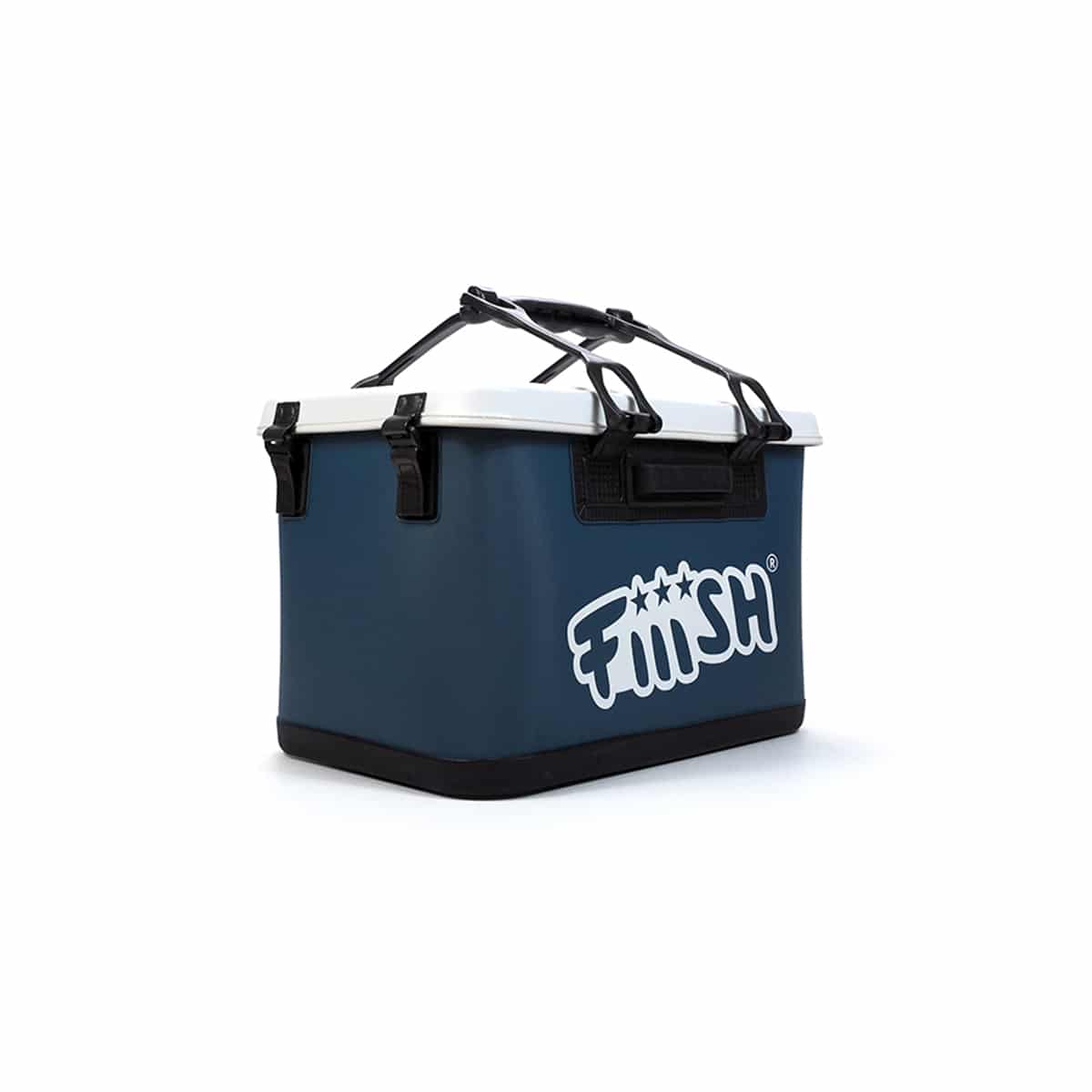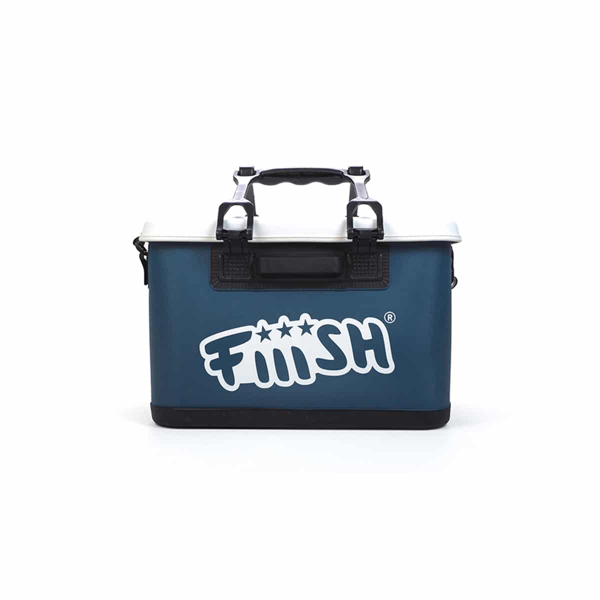 FIIISH BAKKAN รจ una borsa impermeabile al 100% di taglia media realizzata in EVA termosaldata e tappo in PP. Il tappo ha un pratico e veloce sistema di bloccaggio tramite maniglie e cerniere. Borsa di colore blu e tappo bianco. Al suo interno puรฒ contenere fino a cinque scatole 33 x 22 x 5 cm e una scatola 25 x 19 x 6 cm.