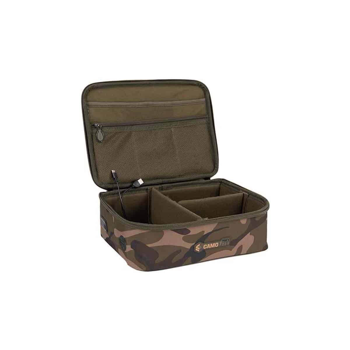 FOX CAMOLITE DELUXE GADGET SAFE รจ una custodia progettata per contenere 2 power bank Fox 48K oppure 1 power bank Fox 96K. Esclusivo coperchio Fox in EVA ottenuto tramite stampo, per posizionare tablet e smartphone di tutte le dimensioni. Due porte di accesso USB sul lato per collegare e caricare facilmente tutti i cavi USB. Una porta di accesso per far scorrere la maggior parte dei cavi USB-C. Divisorie interne per dividere la borsa e creare tutte le aree necessarie per i vostri oggetti elettronici come torce, luci fotografiche e altri articoli utili. Tasca per tablet e tasca in rete con cerniera nel coperchio. Doppie cerniere per impieghi gravosi di alta qualitร . Manico imbottito in poliestere mimetico. 100% poliestere 500 D con esclusiva colorazione Fox Camo. Dimensioni: 23.5 x 31 x 13cm.