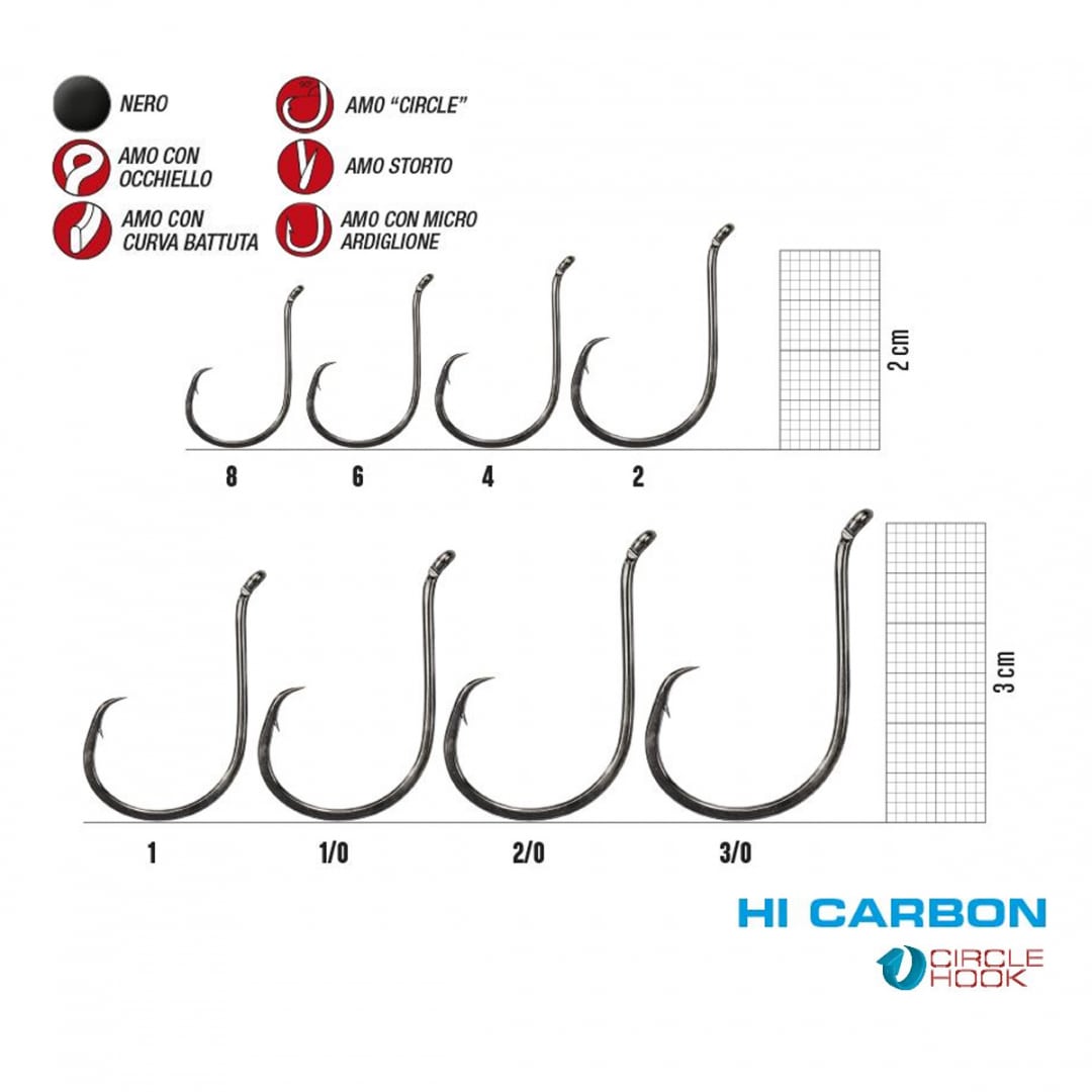 GAMAKATSU OCTOPUS CIRCLE รจ un amo dedicato alla pesca in profonditร di occhioni con tranci di sarda o calamaro, dove eccelle per la tenuta durante il lungo recupero. In sostanza, la sua forma offre la collaudata efficacia della serie Octopus (12840) con la sicurezza supplementare determinata dal profilo “Circle” della sua punta. La sua efficienza si esalta nelle tecniche che prevedono l’auto-ferrata del pesce, come nel caso dellโimpiego dei mulinelli elettrici. Storto e di colore nero, รจ provvisto di un occhiello piegato allโesterno per consentire la legatura del terminale sul gambo. HI CARBON. CIRCLE HOOK. Nero. Amo con occhiello. Amo con curva battuta. Amo storto. Varie misure disponibili.