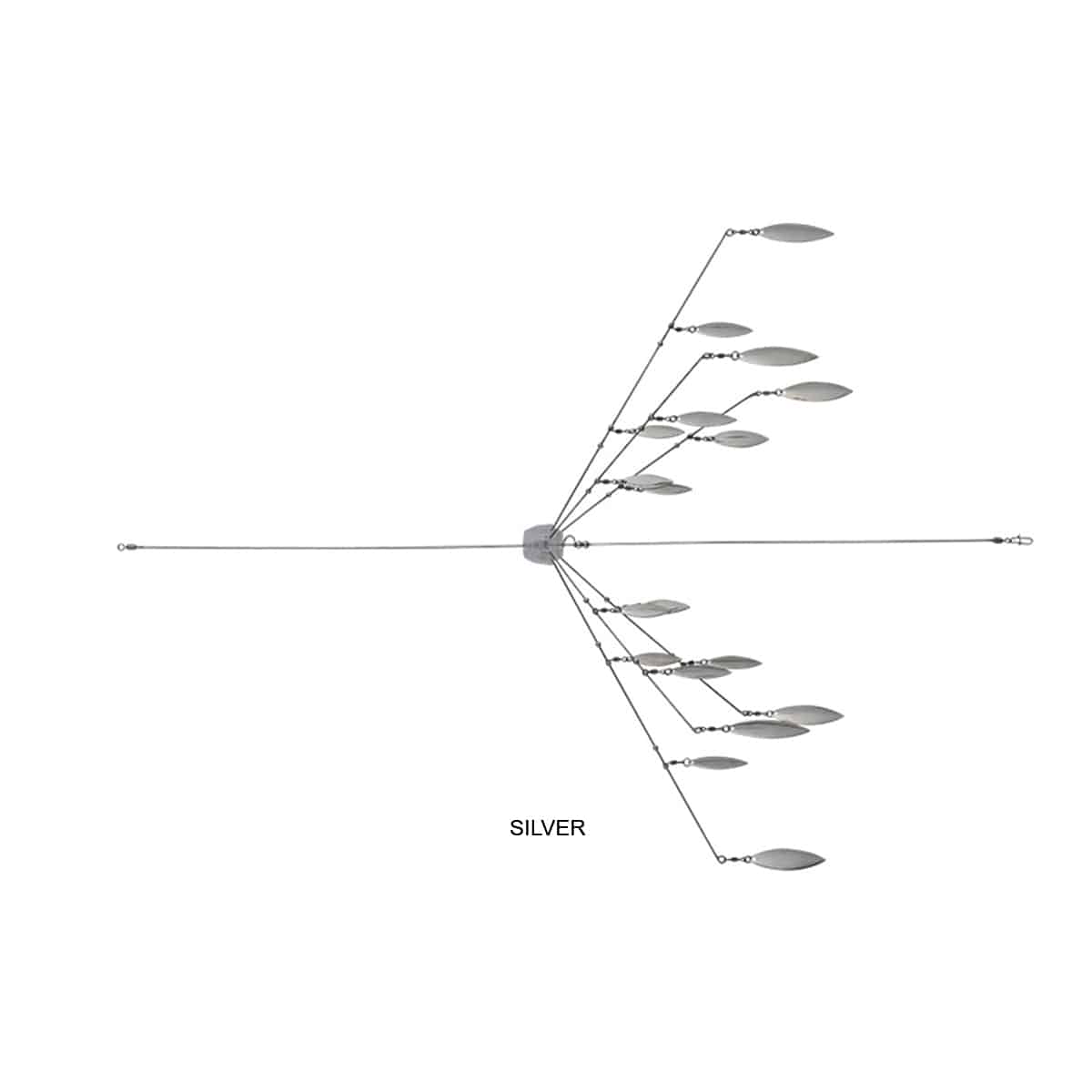 JACKALL BROS LUSTER BLADE 115 è una evoluzione dell’alabama rig! Come mai? Jackall Bros ribalta il concetto di costruzione inserendo un tappo a vite in plastica che permetterà di aprire e chiudere i sei bracci (lunghi 11.5cm) a piacimento risolvendo completamente il problema del trasporto (nella confezione sono presenti 2 tappi di ricambio). Le 18 palette sono state scelte per grandezza e posizione con lo scopo, non solo di creare turbolenza e lampi di luce imitando un branco di foraggio, ma anche quello di creare resistenza in acqua permettendo così un’azione ideale durante il recupero. La parte che andrà collegata alla lenza presenta una girella per smorzare le torsioni durante l’utilizzo. Inoltre, possiede anche un anello per attaccare un peso aggiuntivo in modo da poter far lavorare facilmente il sistema pescante a profondità più elevate. Il settimo braccio è quello “ferrante”, più lungo degli altri per imitare al meglio una preda staccata dal branco e più facilmente predabile. Le possibili combinazioni sono infinite, il pescatore può scegliere in base alle esigenze ed optare per una softbait a piacimento!