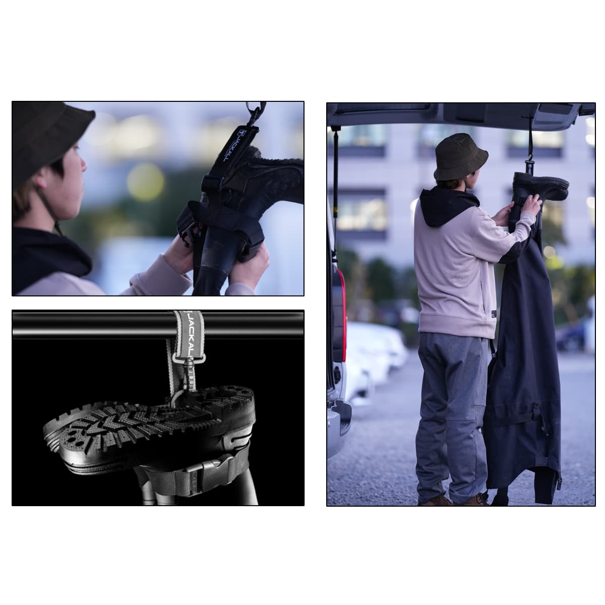 JACKALL BROS WADER&BOOTS HANGER รจ un oggetto molto utile che permette di appendere stivali o wader sottosopra sia per farli asciugare oppure per riporli comodamente. Cintura molto robusta che assicura la tenuta e moschettone che ruota a 360ยฐ. La lunghezza della cinta puรฒ essere regolata in base al luogo dove decidiamo di appenderli.