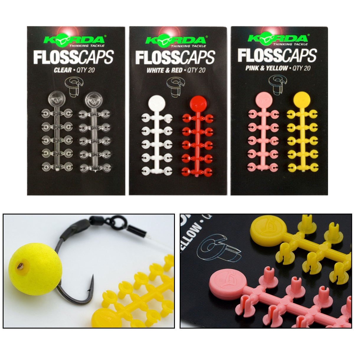 Con molti rig moderni รจ necessario legare lโesca a un anellino o a una micro girella utilizzando il Bait Floss, tuttavia questo procedimento puรฒ risultare complicato, soprattutto se fa buio o si hanno le mani fredde. KORDA FLOSS CAPS risolve questo problema: dopo aver montato lโinnesco sul Floss utilizzando un ago da pasturazione, basterร inserire un Floss Cap a unโestremitร del Bait Floss premendolo poi nellโesca finchรฉ non sarร allo stesso livello. Dopodichรฉ, sciogliere entrambe le estremitร del Floss con un accendino e fissare cosรฌ il Floss Cap. Per abbinarsi allโinnesco o dare un tocco di colore, i Floss Cap sono disponibili di tre colorazioni diverse: trasparente, rosso e bianco, rosa e giallo. Vengono forniti allโinterno di un supporto centrale da cui possono essere facilmente staccati. Ogni confezione contiene 20 Floss Cap, 10 di ogni colore.