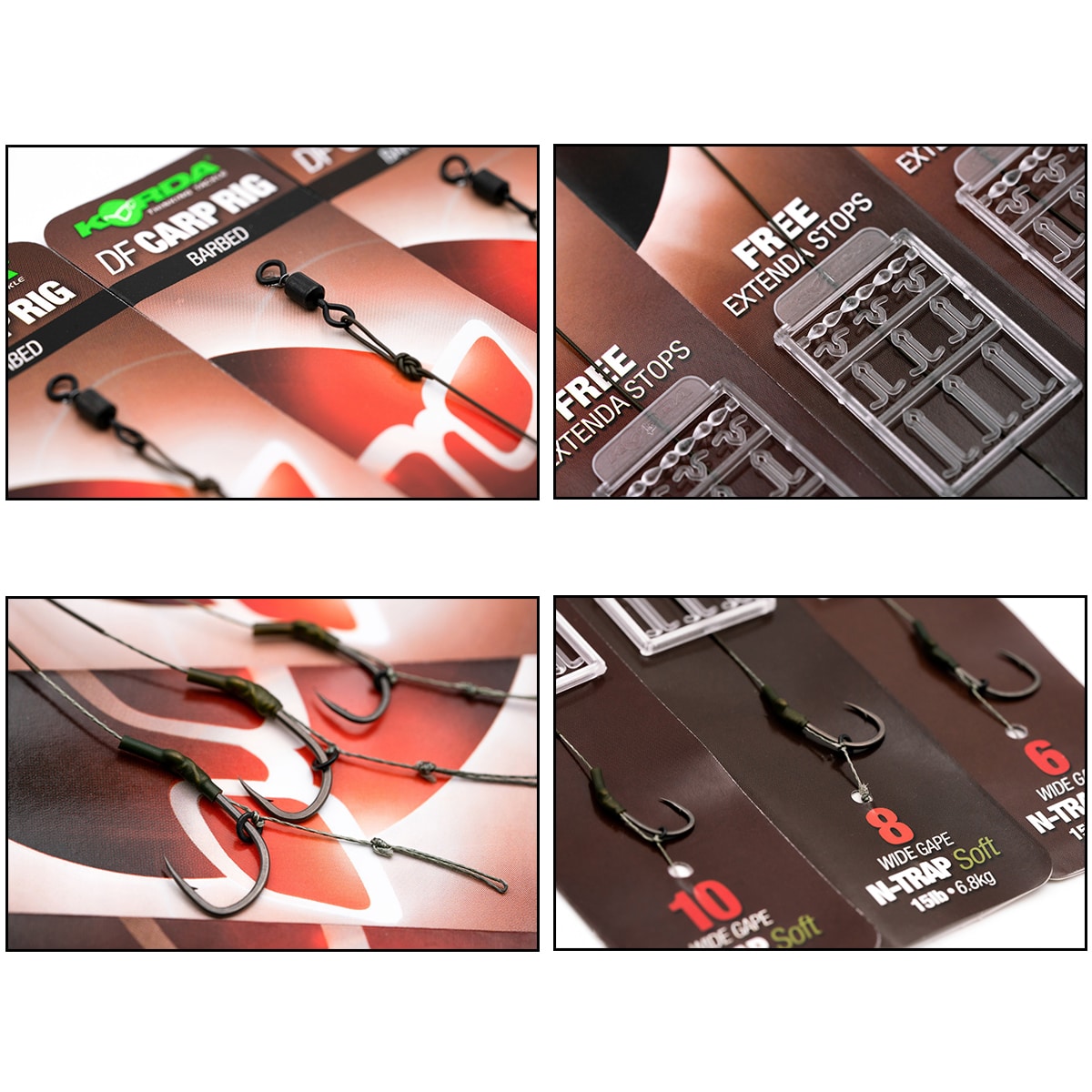 KORDA N-TRAP DF RIG è un DF Carp Rig pre-legato proprio nel modo in cui farebbe Danny Fairbrass, fondatore di Korda, utilizzando gli stessi componenti. Si tratta di un rig molto efficace che può essere utilizzato per esche affondanti, wafter o anche pop-up (aggiungendo un contrappeso). L’anellino presente sul gambo dell’amo per attutire i contraccolpi e il pezzetto di guaina termo restringente che dona aggressività all’amo contribuiscono a fornire un ottimo potenziale di abboccata. Le misure 6, 8 e 10 sono state legate utilizzando l’amo Wide Gape e l’N-Trap Soft da 15 lb, mentre è stata usata la versione da 20 lb per l’amo misura 4 e quella da 30 lb per l’amo misura 2. È inoltre presente una girella misura 8 connessa all’altra estremità tramite un nodo a otto. Disponibile con o senza ardiglione e con ami delle seguenti dimensioni: 2, 4, 6, 8 o 10. Ogni confezione contiene un rig.