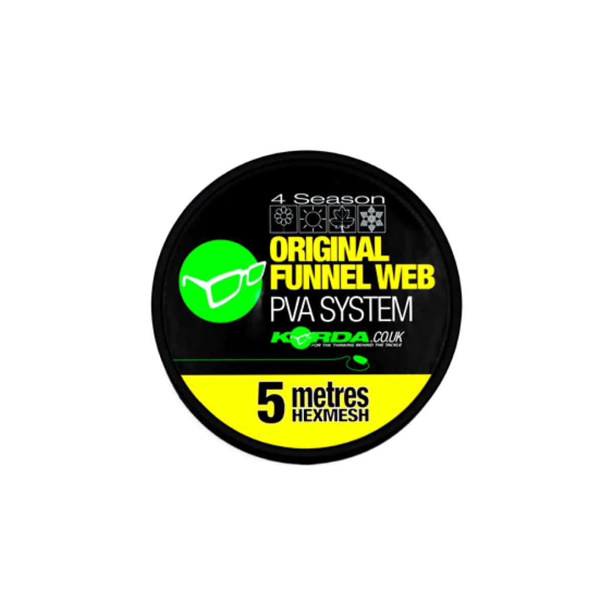 KORDA ORIGINAL FUNNEL WEB PVA SYSTEM รจ una rete con le maglie piรน ampie della gamma per realizzare PVA di grandi dimensioni, stick o piccoli sacchetti di boilies. Disponibile il kit completo (con tubo, compressore e 7 metri di rete) e le ricariche hexmesh e micromesh.