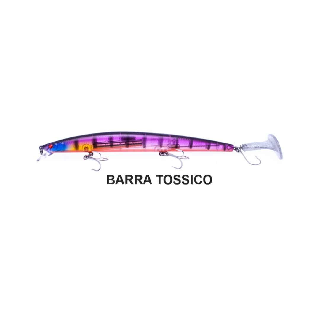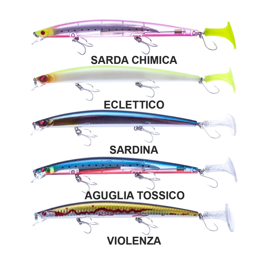 SERRA CUDA GAME BY LABORATORIO รจ un jerkbait rivoluzionario che abbina il meglio del long jerk alla naturalezza della soft swimbait. La coda appositamente studiata nella forma e nella mescola, produce bolle d’aria e turbolenze atipiche sulla normale azione di recupero e sulla jerkata. In fase di stop la coda T-TAIL si muove per inerzia, come la pinna caudale di un vero pesce preda. Questa esca durante le pause rimane semi sospesa, mentre le coda continua a muoversi per il semplice flusso dell’acqua, facendo cosรฌ la differenza per pescare i pesci predatori diffidenti nel primo strato d’acqua. Il sistema dei pesi interni con cilindri in ottone su doppio binario e micro sfere frontali permette distanze di lancio incredibili. I moderni schemi colore sono stati realizzati con i piรน tecnologici sistemi di produzione esistenti, che oltre a durata garantiscono lucentezza e flashing inarrivabile. Al Serra Cuda sono stati aggiunti occhi 3d red riflettenti per aumentare l’effetto adescante nelle fasi statiche, dove costituiscono un facile target. Il corpo dell’artificiale risulta virtualmente incomprimibile, adatto a fronteggiare impatti e forze torsionali elevatissime: questa esca non si spezza in seguito ad un comune urto e non perde colore come accade con prodotti di scarsa qualitร . SERRA CUDA GAME BY LABORATORIO (17,5cm/34g) รจ un jerkbait slow sinking fondamentale nello spinning in mare per sfidare le onde, la distanza e la pesca da scogliere alte, con correnti alla ricerca di grandi spigole, barracuda, serra, leccia. La confezione รจ fornita con 2 CODE.