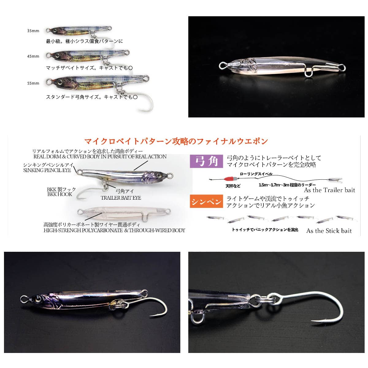 LITTLE JACK AMEZAIKU JP รจ una piccola esca senza paletta che imita un pesciolino foraggio. Il corpo curvo fa si si possa avere una vasta gamma di recuperi, primo su tutti l’azione irregolare. Il corpo รจ realizzato in policarbonato e l’armatura รจ passante in modo da avere una resistenza impressionante nonostante le dimensioni. Le colorazioni basate su di un corpo trasparente per avere un effetto catturante attraverso la rifrazione della luce. Di serie, l’amo รจ attaccato all’occhiello del ventre. Se si vuole usare come esca da recupero come lo Yumikaku, bisogna attaccare l’amo all’occhiello del ventre mentre se si vuole usarlo come pencil affondante nel light game va attaccato all’occhiello posteriore. Naturalmente, i pescatori possono usare uno qualsiasi dei due occhielli a seconda delle loro preferenze. L’amo utilizzato รจ un BKK e la misura รจ scelta in base alle dimensioni dell’esca. LITTLE JACK AMEZAIKU JP 45 รจ equipaggiato con un amo BKK inline misura #4.