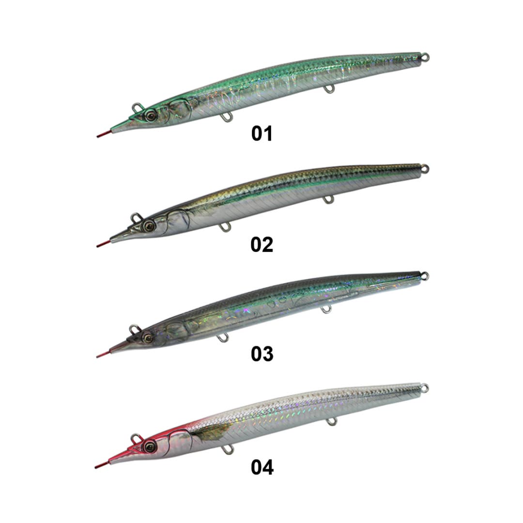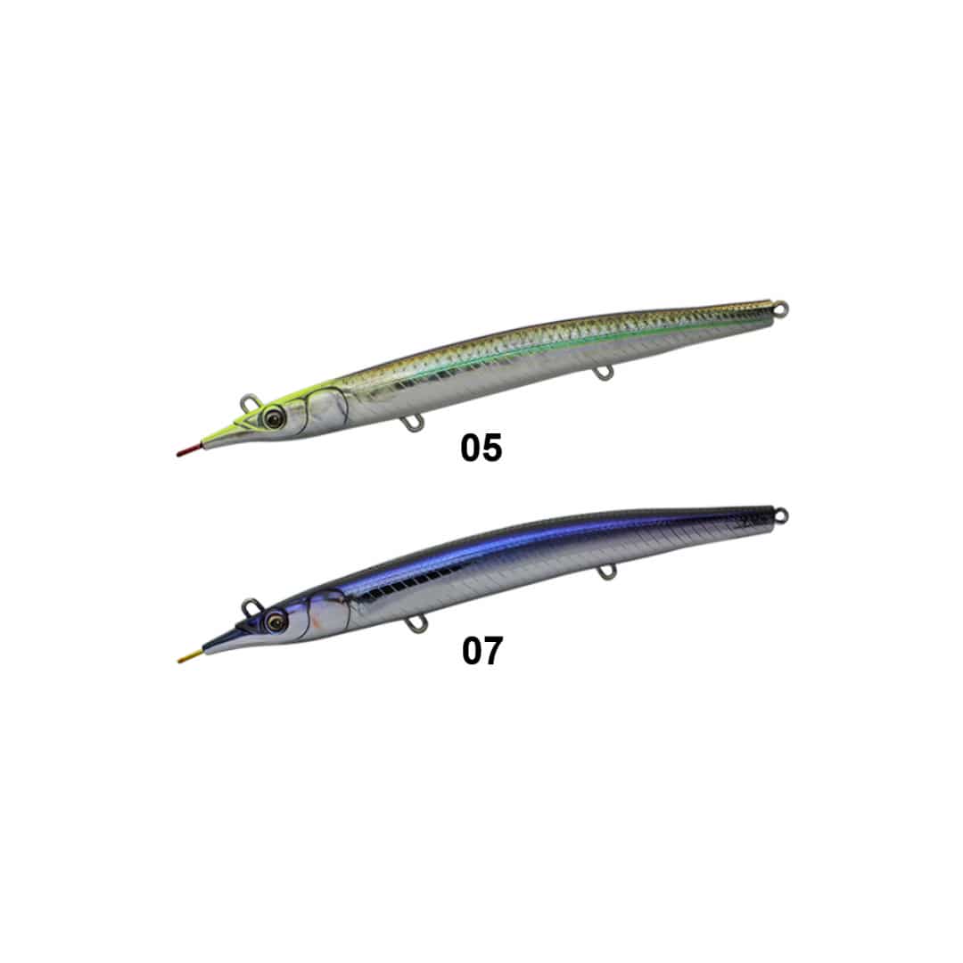 LITTLE JACK SAYORIS-Z รจ la seconda versione del vecchio progetto. Come si puรฒ facilmente evincere dalla forma, questa esca รจ l’imitazione di una piccola aguglia, rostro compreso. Grazie al rapporto peso/volume si riesce a lanciare a notevole distanza (circa 75m). L’anellino di congiunzione con il finale non si trova in punta ma bensรฌ tra gli occhi nella parte superiore. Il risultato รจ un movimento caratterizzato da un accentuato rollio e sbandate laterali sulle jerkate. LITTLE JACK SAYORIS-Z (182mm/28g) รจ affondante ma lavora nello strato superficiale d’acqua.