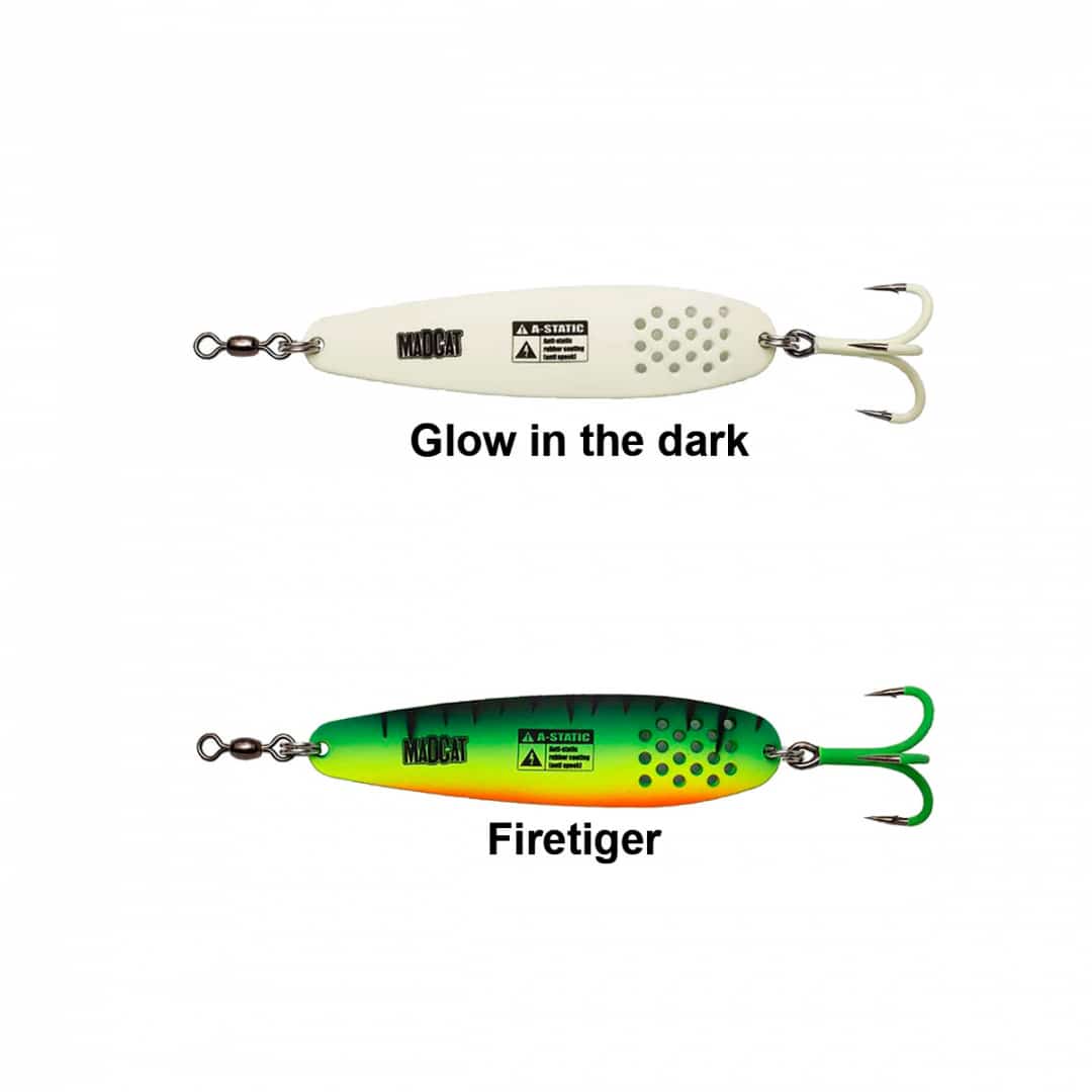 MADCAT A-STATIC TURBINE SPOON รจ un ondulante da 90 grammi dotato di buchi per turbolenze extra e dalla forma slim che lo rende ideale per pescare in zone di corrente abbastanza formata. Armato con una grossa, affilata e potente ancoretta 6X misura #3/0.
