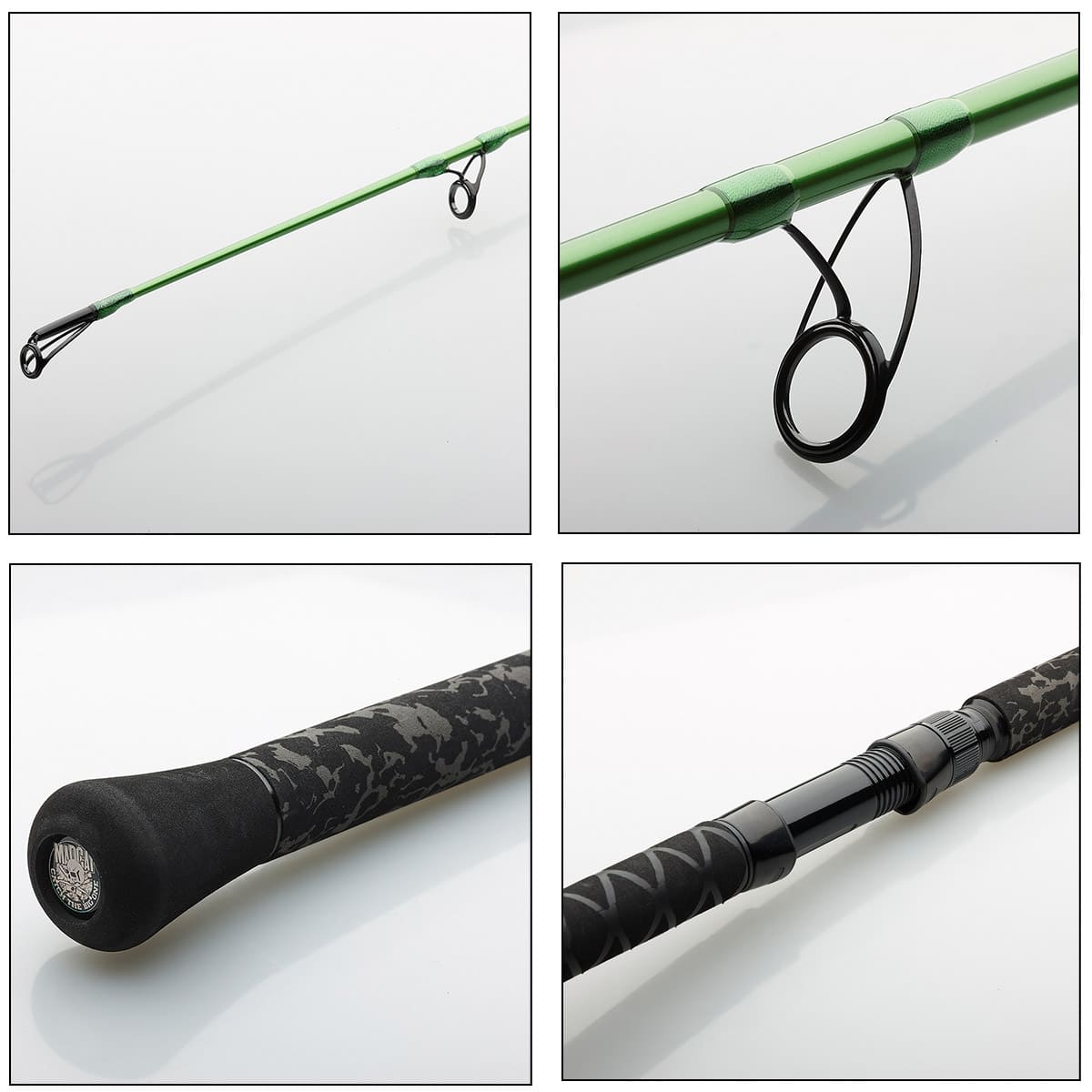MADCAT GREEN PELLET รจ una canna da siluro nata per pescare con i pellet. Rispetto al modello precedente รจ stata accorciata sia perchรจ la pesca si รจ evoluta sia per rendere il combattimento piรน divertente. Rispetto ad alcuni anni fa adesso la pesca del siluro con i pellet si fa con la canna appoggiata al trepiedi quasi verticale, in modo da rendere minore il rischio di impigli. Anellatura SeaGuide anti parrucca e placca portamulinello Fuji.