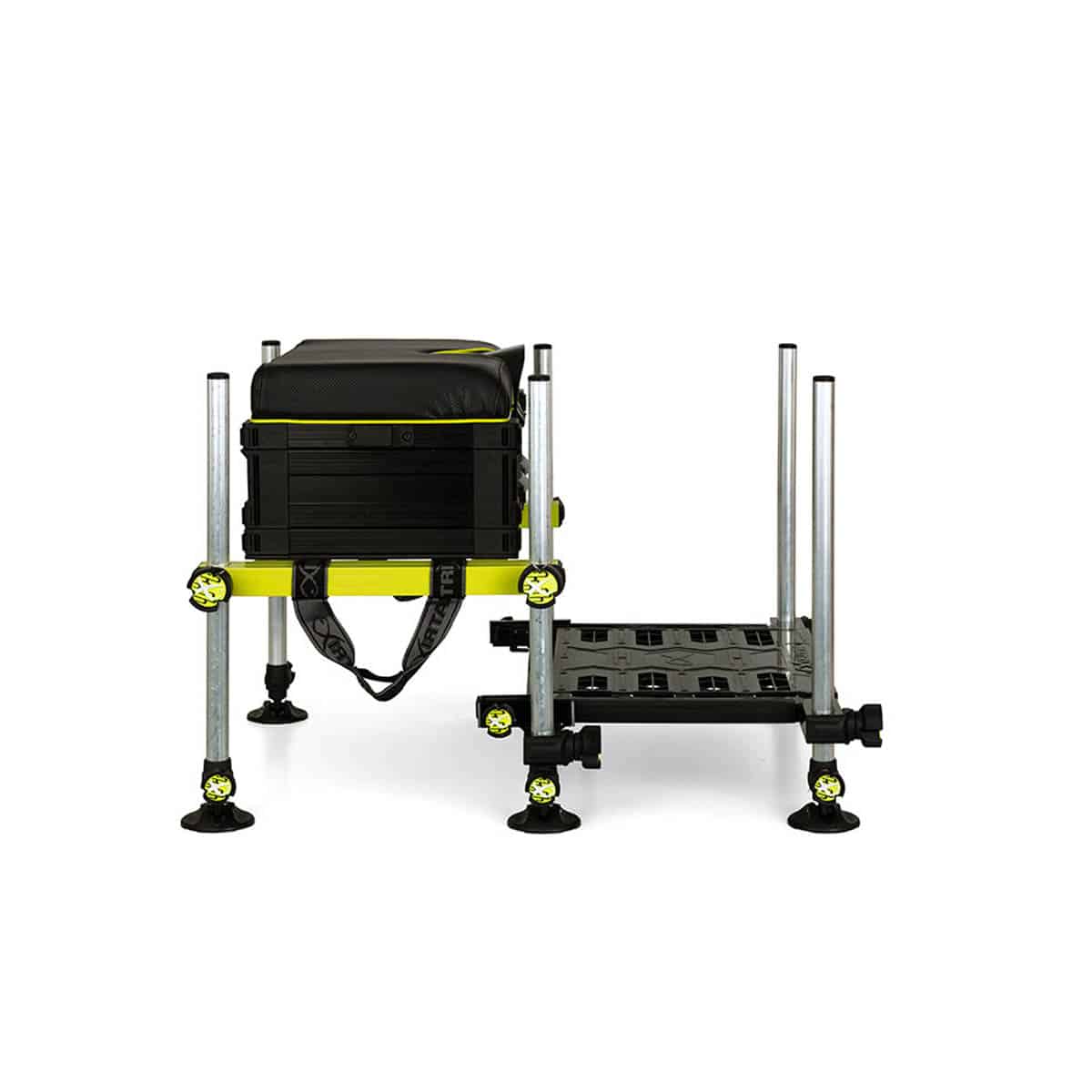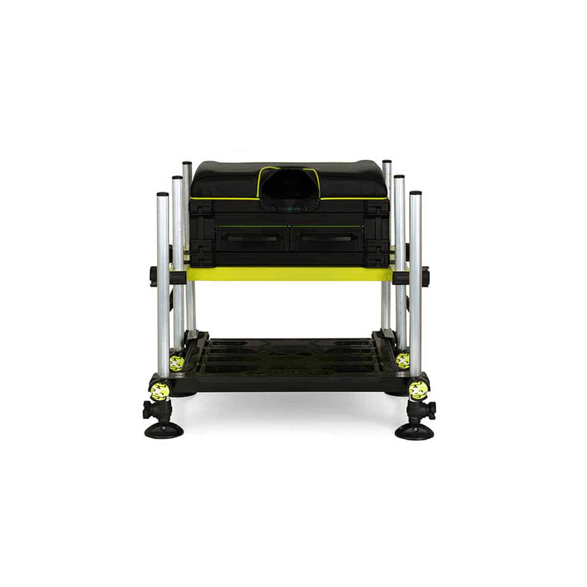 MATRIX P25 MK2 SEATBOX è un panchetto costruito con un telaio leggero ad H in alluminio di colore verde lime che contrasta con la pedana in nero. Fornito con cinghia imbottita removibile. Dotato di un nuovo sistema di blocco della pedana scorrevole anti-graffio. Formato da sei gambe rotonde telescopiche regolabili da 25mm. Piedi mobili anti-fango per stabilità extra anche su terreni scoscesi. Tutte le gambe includono un tappo filettato sulla parte superiore. Costruito con il fantastico sistema di cassetti estraibili modulari Matrix. Sedile imbottito con livella a bolla integrata.