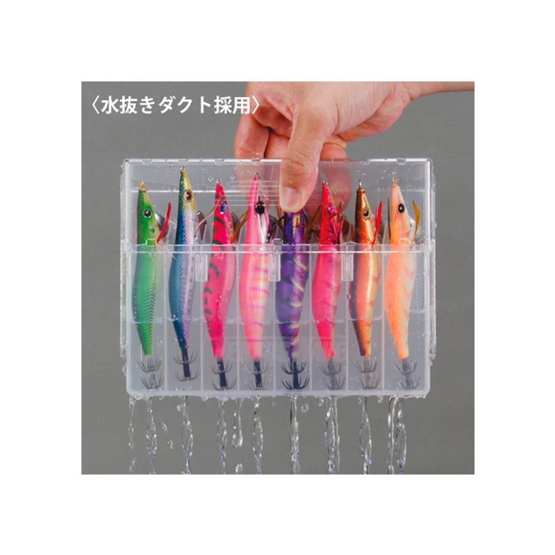 MEIHO VERSUS VW-ES2051 EGI STOCKER è una scatola porta squid jig che elimina la seccatura di star sempre ad aprire e chiudere il tappo di una normale scatola porta esche. Ogni totanara viene riposta nel proprio alloggio in verticale. E’ possibile risciacquare gli squid jig senza toglierli dalla EGI STOCKER poichè è dotata di fori di scolo. Può contenere fino a 8 squid jig di misura compresa tra 2.5 e 3.5. Compatibile con le valigette MEIHO VS-E6552, VW-2070, VW-2055, VS-7070 E VS-7055. FECO, prodotto Eco-friendly certificato dall’organizzazione giapponese JB/NBC. Dimensioni: 200 x 150 x 33 mm. Colore fumé o Clear (trasparente). Made in Japan.