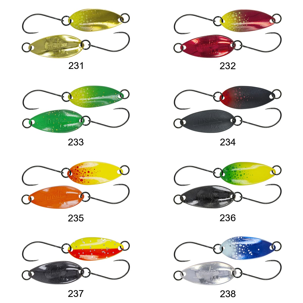 MOLIX ELITE AREA SPOON è un ondulante specifico realizzato per l’utilizzo nel Trout Area Game. La particolare curvatura permette allo spoon di essere animato anche a basse velocità rendendolo estremamente reattivo alle sollecitazioni trasmesse dal pescatore. Munito di amo barbless, è lungo 28mm ed è disponibile in tre grammature per soddisfare ogni necessità . Varie colorazioni disponibili.