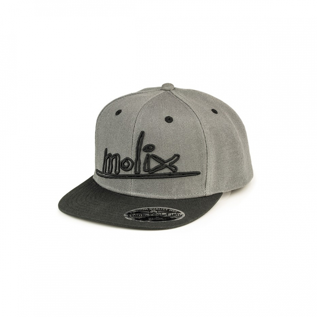 MOLIX PREMIUM SNAPBACK GREY รจย un cappellino con visiera dritta. Acrilico 100%. Colore grigio con inserto stampato trama โMOLIXโ. Logo laterale e posteriore ricamati. Chiusura posteriore regolabile in PVC.