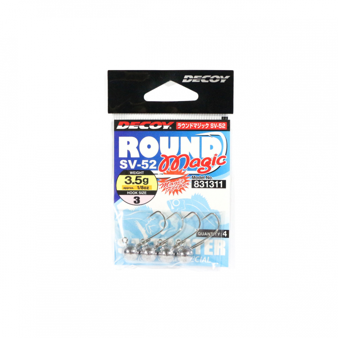 DECOY SV-52 ROUND MAGIC รจ una testina piombata dalla classica forma rotonda, adatta a tutte le situazioni del light game. La testaย in piombo รจ rivestita di nickel. Questa jig head รจ dotata di keeper in modo tale da tenere la softbait ancora piรน salda.