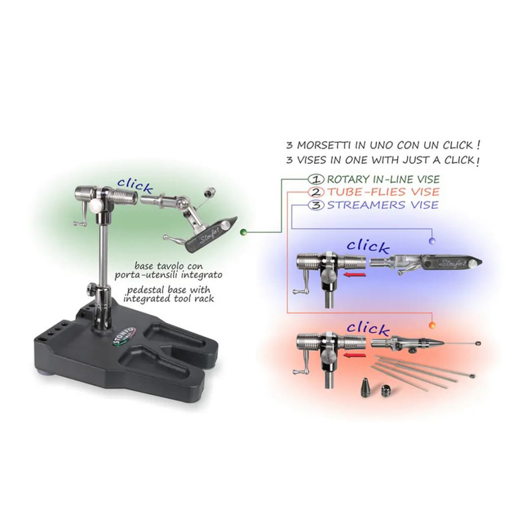 STONFO MORSETTO TRANSFORMERย รจ un prodotto ad alta tecnologia che grazie ad un dispositivo innovativo di sgancio rapido dell’albero si trasforma in un attimo in un morsetto in-linea o in un morsetto per la costruzione di tube-fly oppure in un morsetto per la realizzazione di streamers. Tre morsetti in uno con un semplice click. Costruito in acciaio inox con albero rotante su cuscinetti per una fluida rotazione. Tutti i componenti che compongono i tre morsetti sono inclusi con il Transformer. La base molto stabile รจ munita di nicchie e di un pratico porta utensili integrato. Altre importanti caratteristiche del Transformer sono: intercambiabilitร  delle pinze, frizione progressiva sul movimento di rotazione, blocco della rotazione in qualsiasi posizione, blocco rapido della rotazione a step di 45ยฐ, regolazione in altezza, adattamento per mancini. Altri accessori inclusi: supporto bobinatore-parachute in acciaio inox sagomato ad U con pinzetta parachute e accessori, molla blocca-materiale regolabile, perno di supporto, chiavi a brugola e istruzioni dโ€™uso.