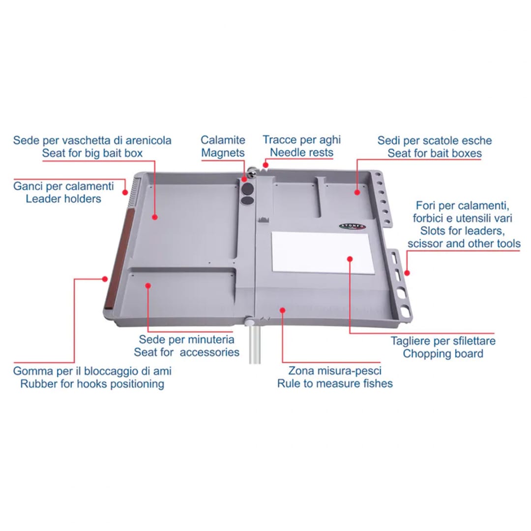 STONFO SERBIDORAย ripiegabile e leggera progettata per venire incontro alle molteplici esigenze del pescatore. La sua struttura in materiale plastico resistentissimo รจ perfettamente smussata e priva di angoli taglienti. Le nicchie di cui รจ munita possono contenere varie vaschette porta-esche in posizione perfettamente stabile. Altre caratteristiche importanti fanno di questa serbidora un vero e proprio completo banco di lavoro. Attacco a vite metallica universale per paletto (non incluso)ย posto centralmente.