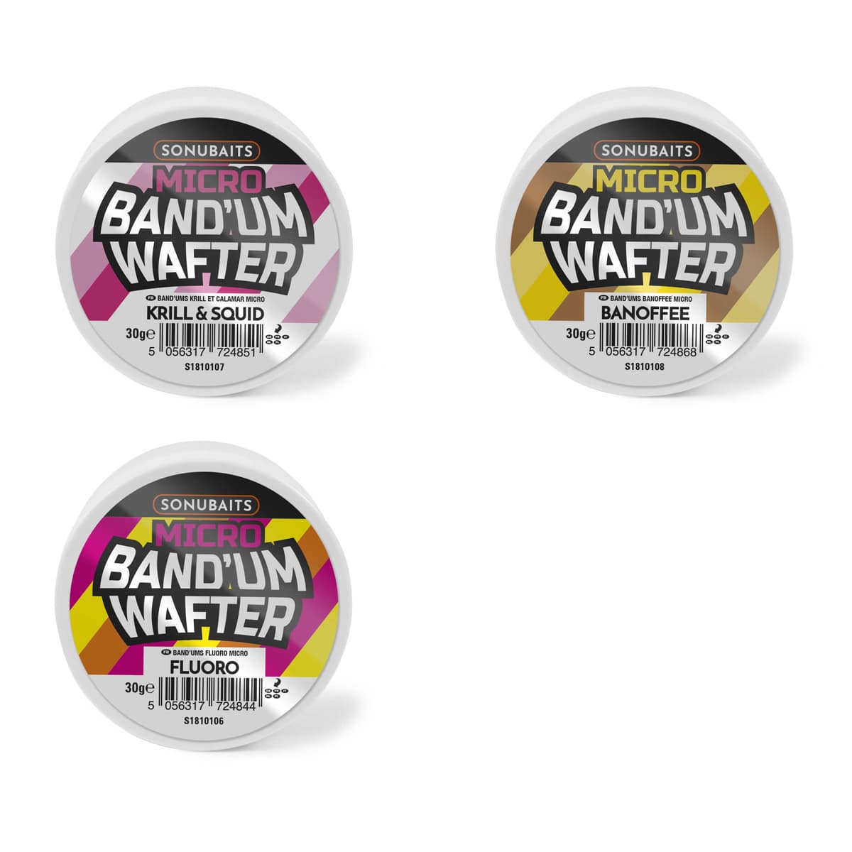 SONUBAITS MICRO BAND’UM WAFTER รจ stato sviluppato dai pro staff Des Shipp e Jamie Hughes poichรจ il trend della pesca Method Feeder si sta spostando su inneschi piccoli e quindi anche loro sono entrambi della mentalitร che un piccolo innesco poco appariscente puรฒ aiutarte ad agganciare piรน pesci. La confezione contiene tre colori diversi. Disponibile in tre gusti (Fluoro, Banoffee, Krill&Squid).