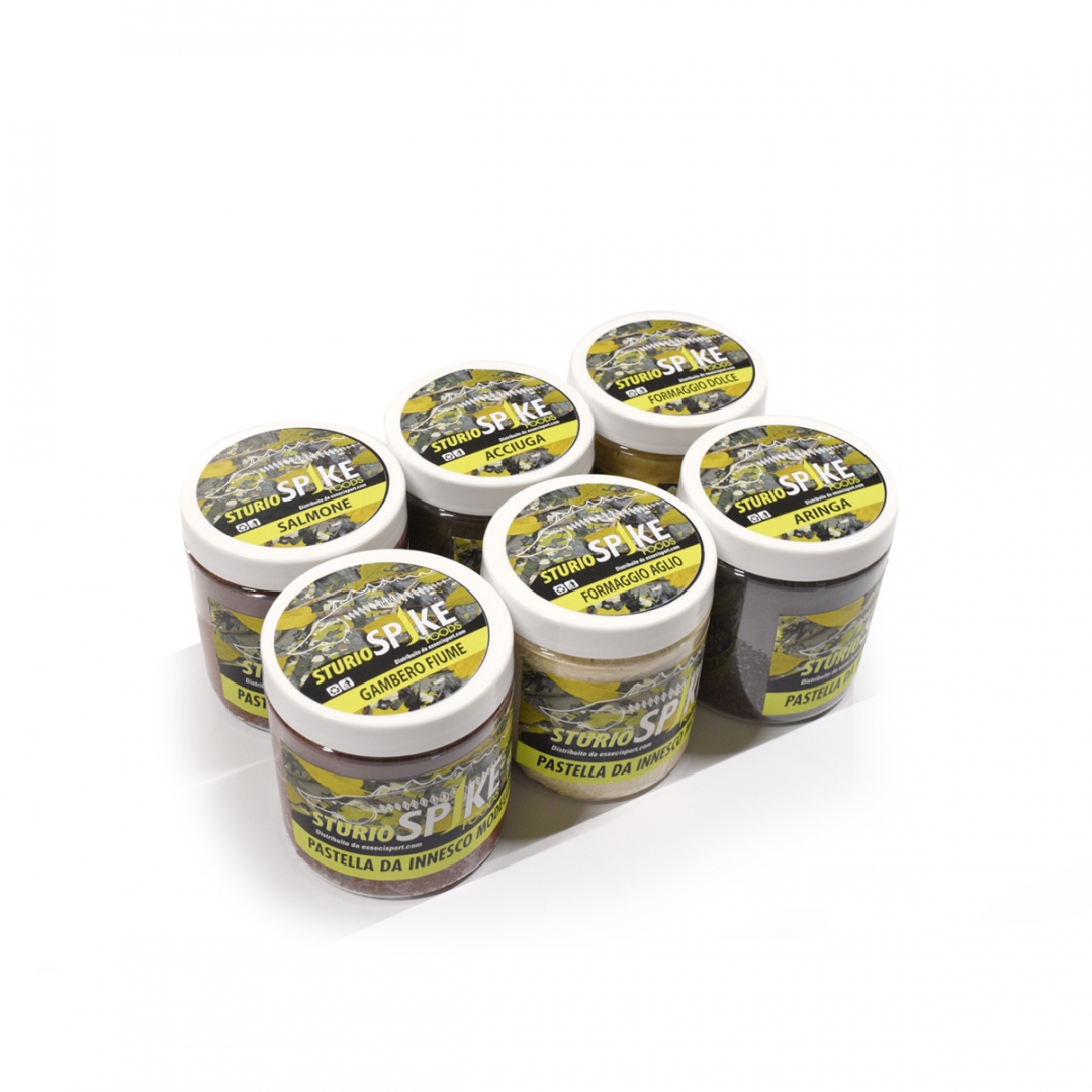SPIKE STURIO รจ una linea specifica per la pesca allo storione. PASTELLA MODELLABILE DA INNESCO รจ stata concepita per essere modellata sull’amo. In base alla dimensione dell’amo va utilizzata piรน o meno pasta modellabile. Prodotta in ben 6 gusti (formaggio dolce, formaggio aglio, aringa, salmone, gambero di fiume, e acciuga). Confezione da 300gr. MADE IN ITALY.