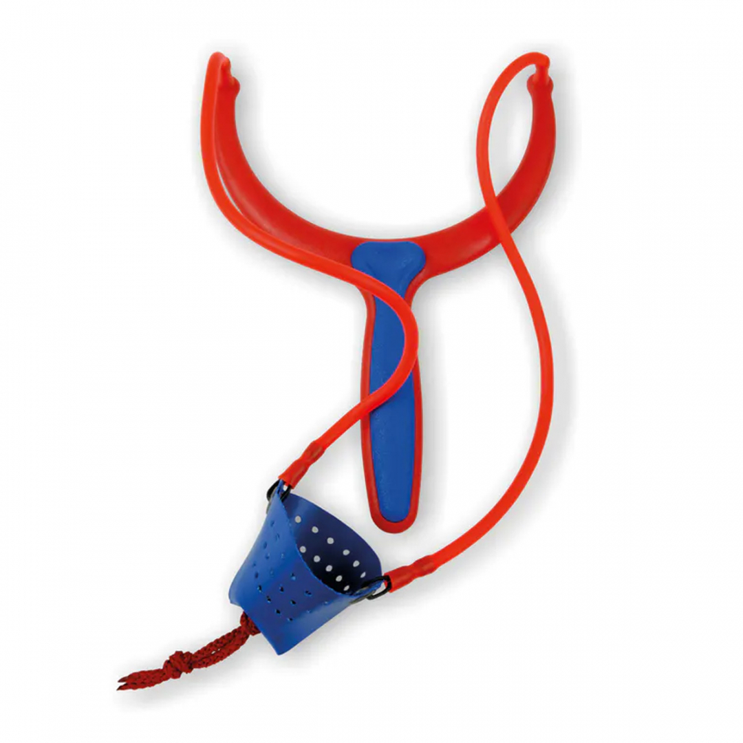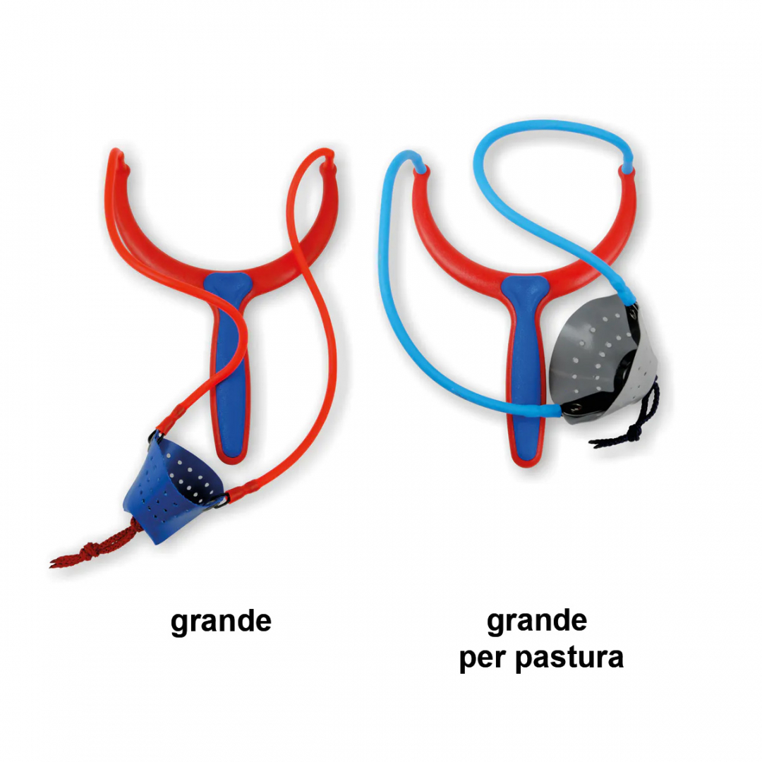 Fionda Twin Colour Grande prodotta da Stonfo. La fionda con elastici di buona potenza è disponibile con bicchierino grande con supporto plastico interno o con bicchierino per pastura con supporto plastico sagomato interno.