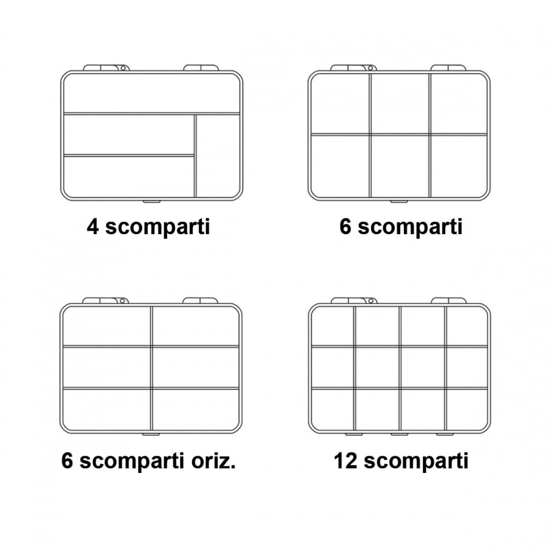 STONFO SCATOLE F TYPE sono scatole anti-urto, compatte, leggere, trasparenti. Adatte per contenere vari tipi di artificiali e minuteria varia. Munite di piccolo foro per esse attaccate al gilet. Disponibili in 4 varianti: 4 – 6 – 6 oriz. – 12 scomparti. Dimensioni 120x85x25 mm.