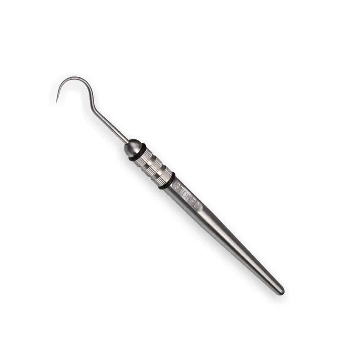 STONFO SPILLO CURVO ELITEย in acciaio inox con caratteristica curvatura ad U. Indispensabile nell’esecuzione del dubbing in asola e dubbing brush per districare intrecci e riordinare i peli rendendo il risultato finale vaporoso ed omogeneo.
