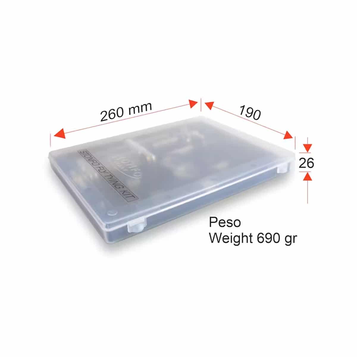 STONFO FLY TYING KIT รจ un set composto da un morsetto Flylab e 7 utensili per la costruzione di mosche artificiali e streamers. Fornito in una robusta scatolaย BOX 260X190X26ย il cui interno in gomma รจ sagomato per dare ad ogni utensile un preciso alloggiamento. Contenuto: Morsetto Flylab, Forbicine, bobinatore Bobtec1 con tensionamento del filo regolabile, Passafilo, Annodatore-Annodatore conico, Spillo di montaggio, Pinza per hackles, Rotodubbing mini, chiave a brugola. Allโinterno dettagliate istruzioni per lโuso del morsetto e dei vari utensili.