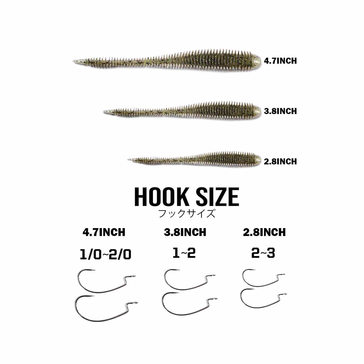 SUNNY BROS DRUG STICK è un soft worm la cui principale caratteristica è l’azione BUBBLE creata dal rilascio delle bollicine d’aria da parte delle costine da cui è composto tutto il corpo che non è circolare ma ovale in considerazione dell’efficienza dell’allamata. Rendendolo ovale è possibile sfruttare la velocità di caduta anche orizzontalmente (il lato largo è in basso) e verticalmente (il lato stretto è in basso). Quando cade, la coda cattura molta acqua e riproduce il leggero movimento sinuoso del nuoto dei piccoli pesci. È un worm che è davvero una caramellina per il Bass, con la quantità di sale, lo scent al gambero, le bollicine emesse e le leggere vibrazioni. Si presta bene a molteplici inneschi come: Neko Rig, No Sinker Rig, Jig Head, Texas Rig, Jika Rig. SUNNY BROS DRUG STICK 2.8″ (7.1cm) può essere innescato con efficacia con un amo wide gap misura 2 o 3. Varie colorazioni disponibili.