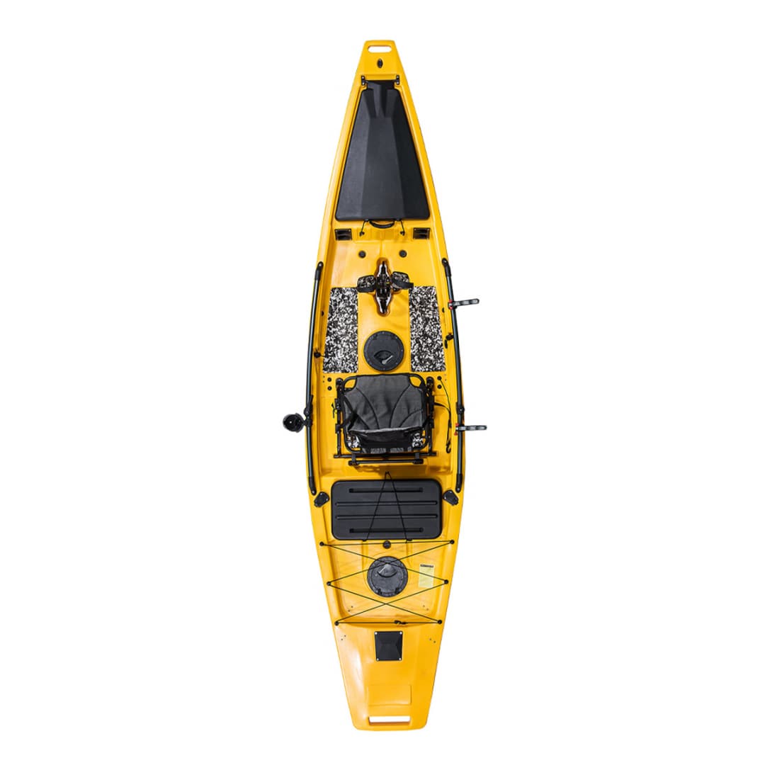 Il Tide Predator Step 14 è un kayak di 14 pidi con sistema di propulsione a pinne e timone basculante con controllo a leva. Il sedile in alluminio, rivestito in tessuto impermeabile, è rialzato. Lo scafo è dotato di 4 porta canna in PVC, barre laterali per installazione accessori e maniglie per il trasporto.